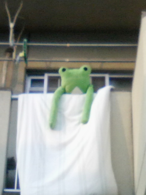 ふもふもくんがアパートのベランダから下界を見下ろしてるよ。